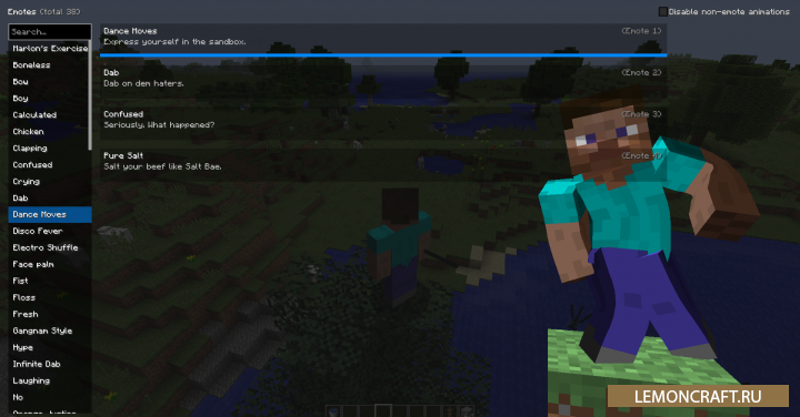 Мод на эмоции для игрока Emoticons придаст больше реалистичности игре путем введения новых эмоций для игрока. В игру будут добавлены 38 новых эмоций, которые сделают поведение вашего персонажа более реалистичным. Например при ходьбе игрок будет сгибать колени и локти, во время плавания появятся новые движения, как при беге, приседании и других действиях игрока. Так же ваш игрок сможет танцевать 12 разными стилями, смеяться, плакать, хлопать в ладоши. Все эмоции вы сможете настроить через специальное меню.