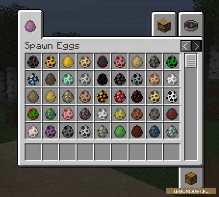 Мод на вкладку для яиц Egg Tab небольшая модификация, которая сделает более удобным процесс работы с яйцами призыва. После установки мода в меню творческого режима появится отдельная вкладка в которую и будут перемещены все яйца.