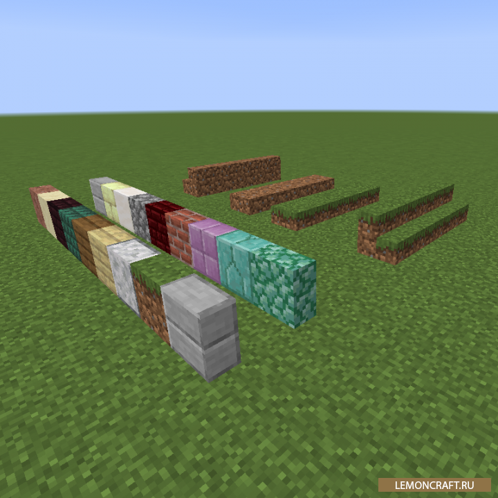 Мод на вертикальные полублоки Extended Slabs + добавит в игру различные варианты вертикальных полублоков, угловые блоки, лестницы, а так же полублоки для различных ванильных материалов. Данный мод совместим с модом Biomes O' Plenty.